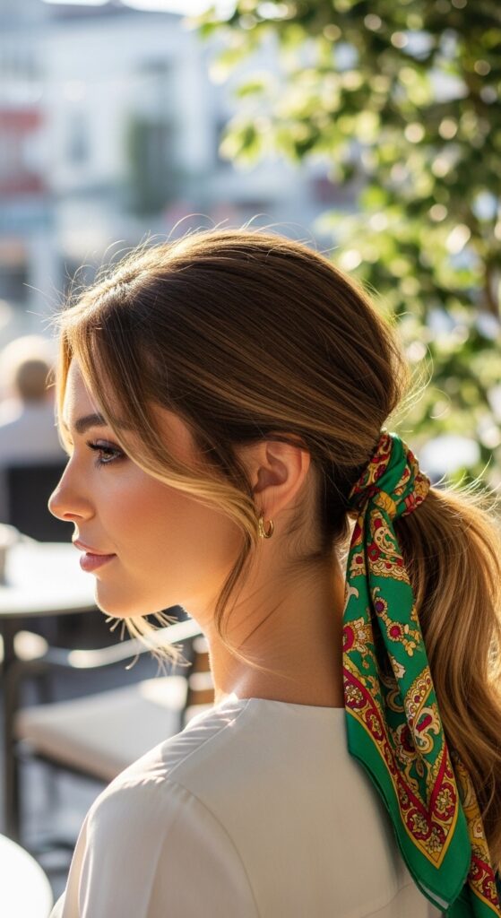 After securing your low ponytail, take a small silk or satin scarf. Tie it around the hair tie in a simple knot or bow, letting the ends drape down.