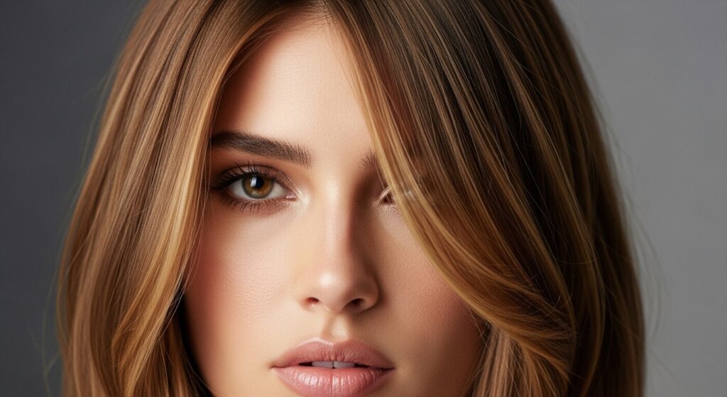 4. Curtain Effect: Caramel tones are placed to frame the face like opening curtains, darkest at the roots near the part, blending to lightest at the ends around the face.