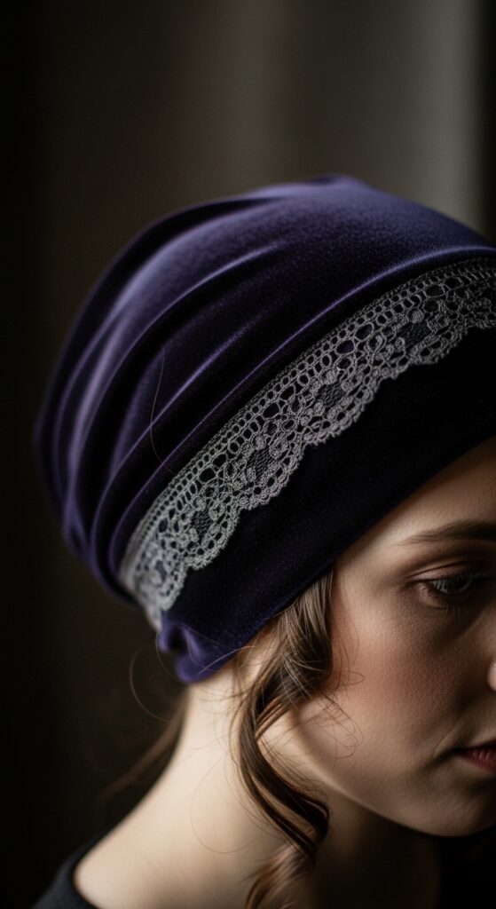 Think rich fabrics like velvet or brocade, often with lace or embroidery. You can find wraps that tie or pre-sewn turbans. Pair it with your favorite earrings for a look that’s deeply personal and artistic.