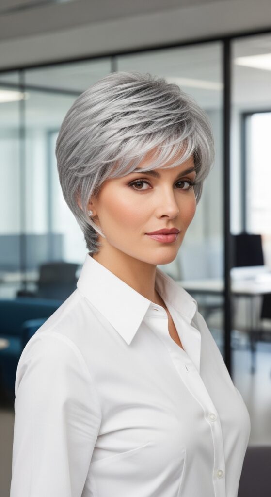 For work or formal settings, a sleek, well-cut pixie wig in a sophisticated color like grey, silver, or a natural brunette is impeccable. It reads as confident, capable, and stylishly mature.