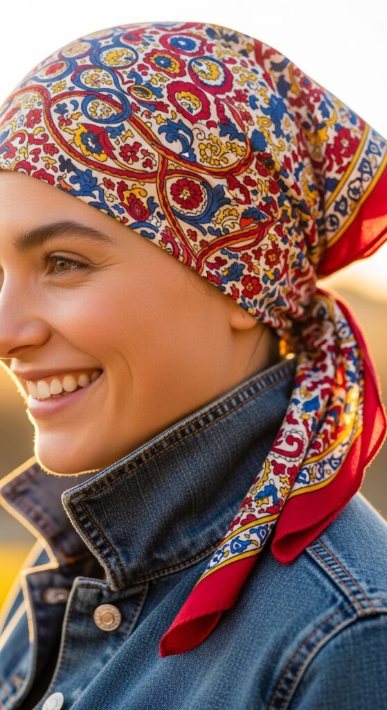 You can choose classic bandana prints, florals, or solids. It’s a lightweight option that adds a pop of color and a sense of fun to your outfit. It feels youthful, spirited, and unapologetically cute.