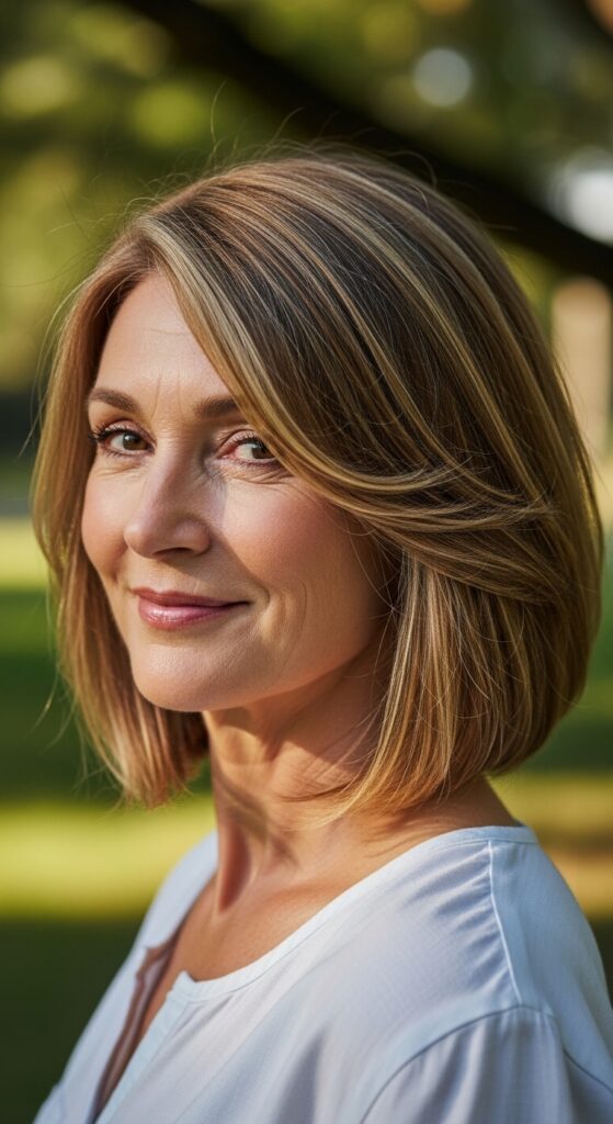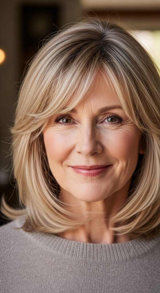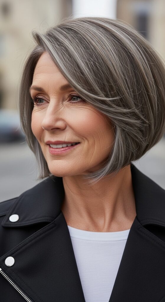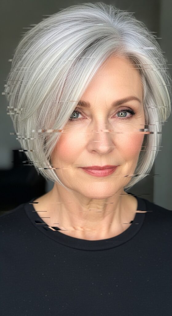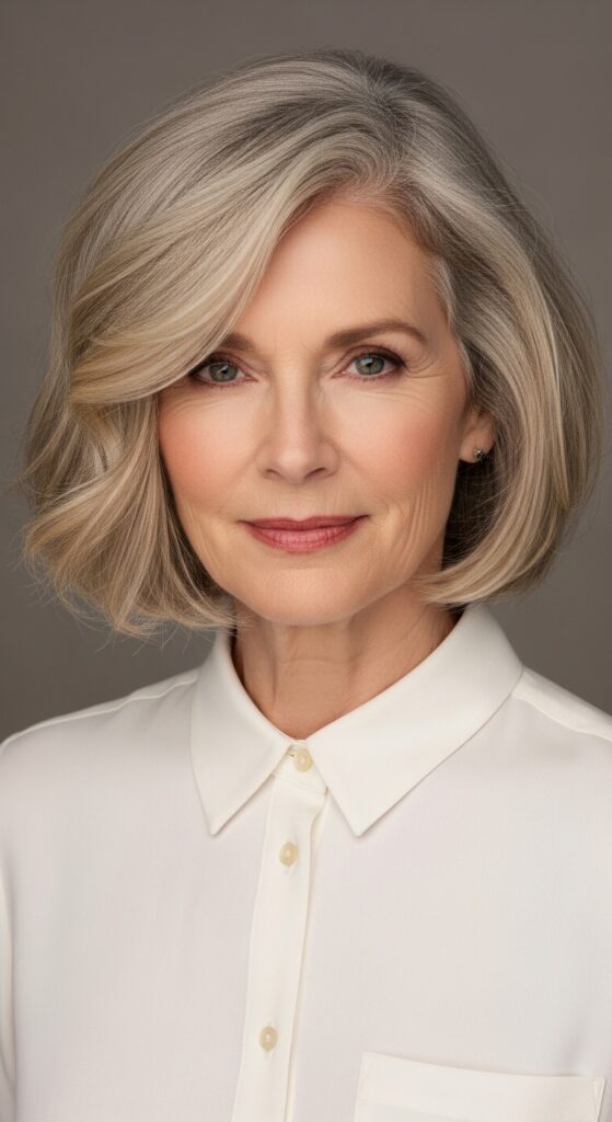 A blunt lob with a deep side part is one of the most flattering cuts for women over 60. The deep part adds instant volume at the crown, and the blunt ends give the hair weight and polish.