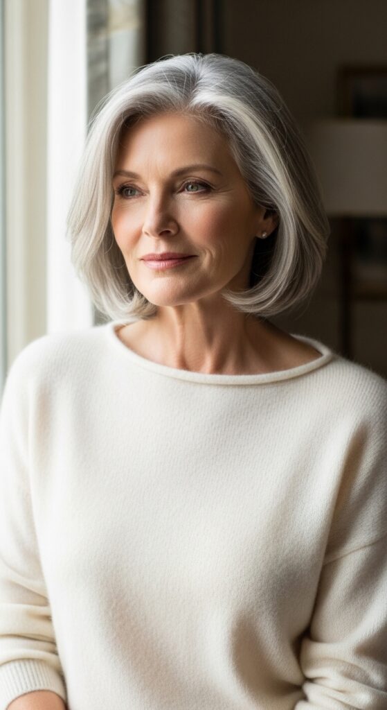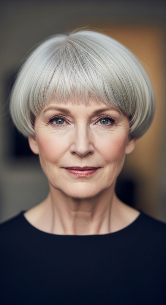 I know what you’re thinking—a bowl cut? But trust me, the modern version is nothing like the one you had in the 70s. It’s rounded, soft, and incredibly chic, especially in a silver blonde shade.