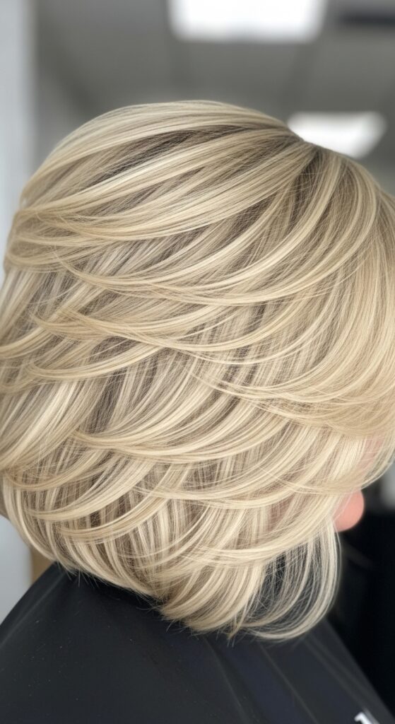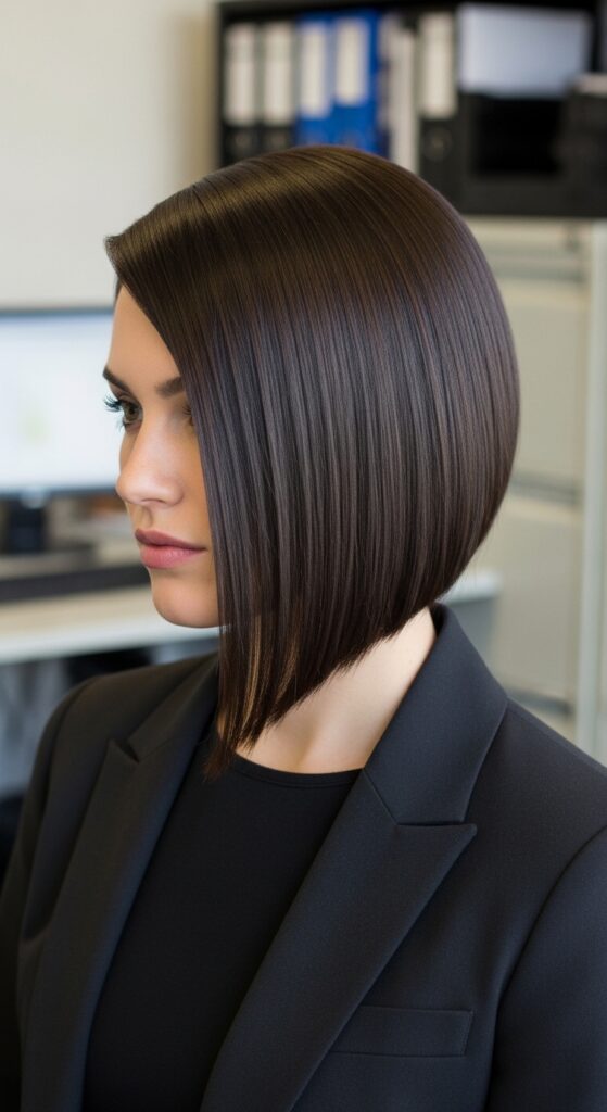 The cut is often slightly longer in the front with a soft curve under. The color is rich and dimensional, never flat. It whispers elegance.