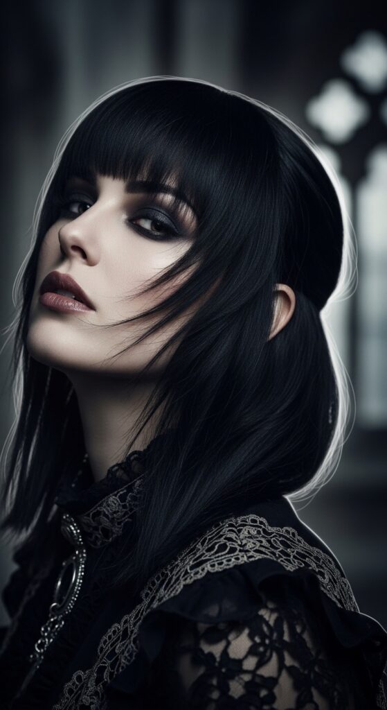 Enter the romantic goth hairstyles realm. The vampire haircut is a lob with extreme, wispy curtain bangs and lots of shredded texture. It’s dramatic, poetic, and a little undone.