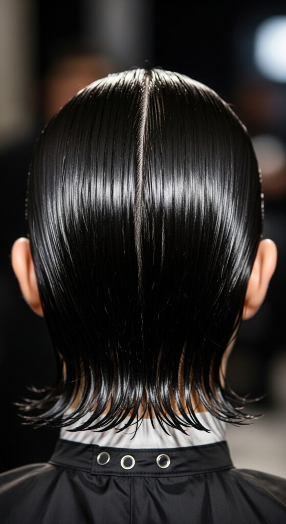 This high-fashion, red-carpet style is all about drama. Hair is slicked back with gel or cream for a soaked, glossy effect, showcasing the perfect cut of your lob.
