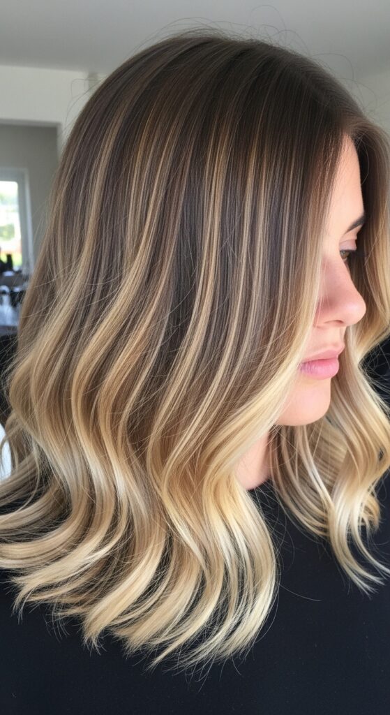 Bronde—that perfect blend of brown and blonde—is a dream color for a lob. A balayage application adds sun-kissed, natural-looking dimension from roots to ends.