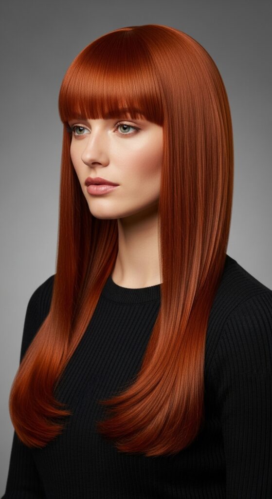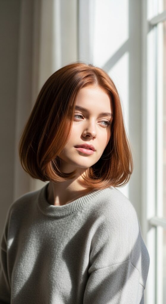 Think quiet luxury hair, but make it copper. This is a polished, chin-length bob in a sophisticated, burnished copper shade. It’s all about healthy, shiny hair with a perfect blunt cut.