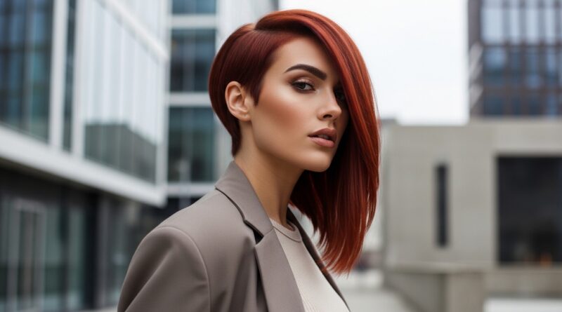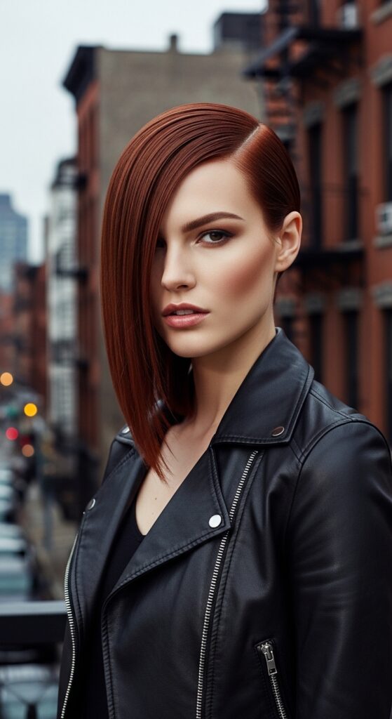 Pair it with a deep, auburn-infused copper for a look that’s sharp and warm. The angled cut makes the color appear even more dynamic. It’s a power haircut.