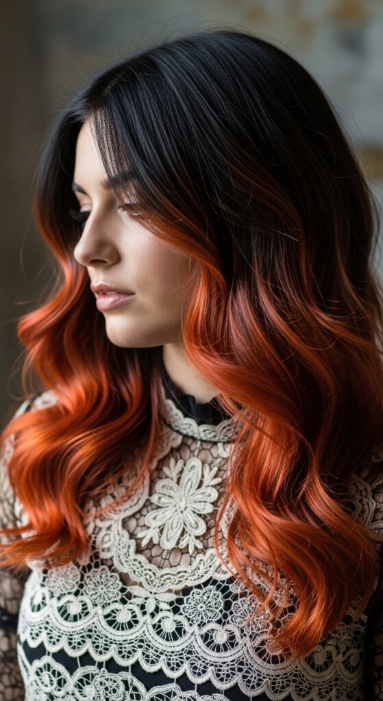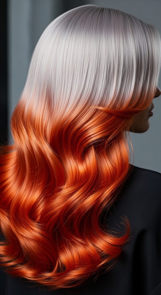 The ultimate contrast. This style starts with cool, almost silvery roots that dramatically melt into hot copper ends. It looks editorial and fearless.