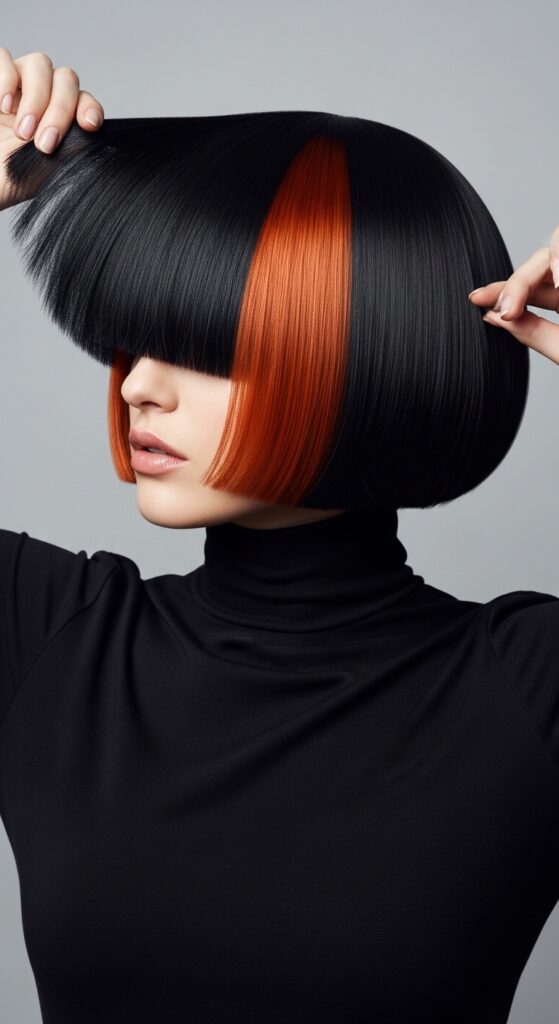 Talk about graphic. Imagine a sharp, blunt black bob with just the very underside painted in electric copper. It’s hidden when your hair is down, but flashes of wow when you move.