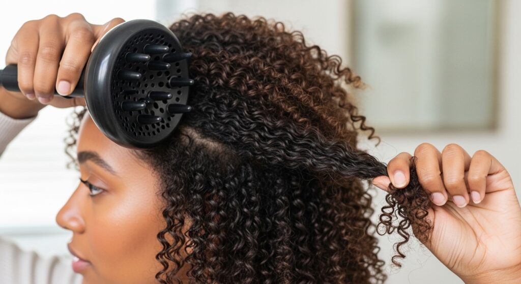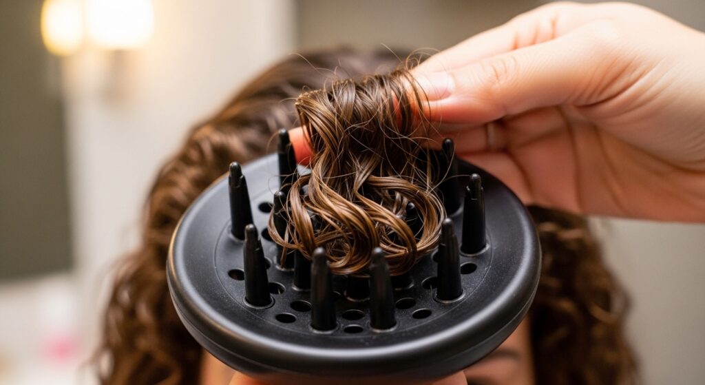 11. Root-to-Tip Cupping: For tighter curls, use your hand to guide a curl clump from the very root into the diffuser bowl, ensuring the entire strand from scalp to end is supported.