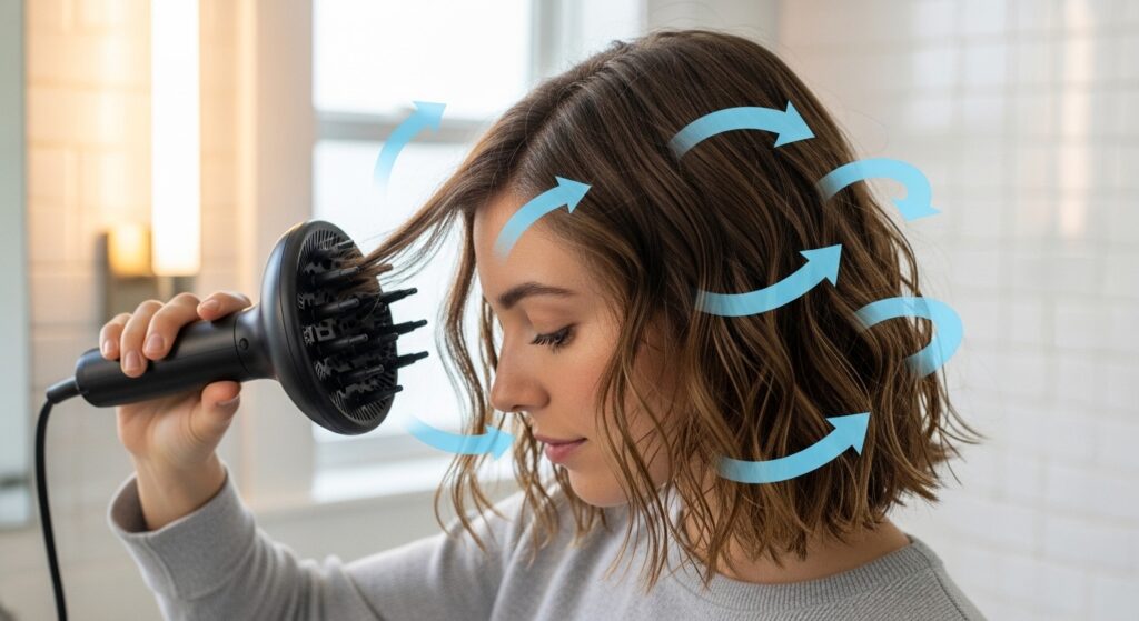 6. The “Cradle” for Lengths: Focus on drying your mid-lengths and ends first by cradling them in the diffuser, preventing heavy, wet ends from pulling out your root waves.