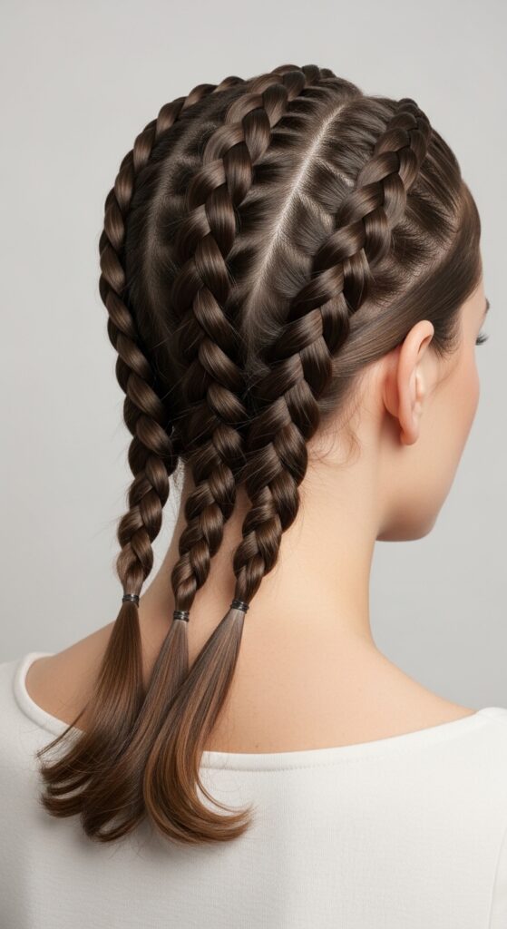 Part your hair into three horizontal sections, then Dutch braid each one. Join them at the end into a single ponytail or bun. It’s detailed but surprisingly fast once you get the rhythm.