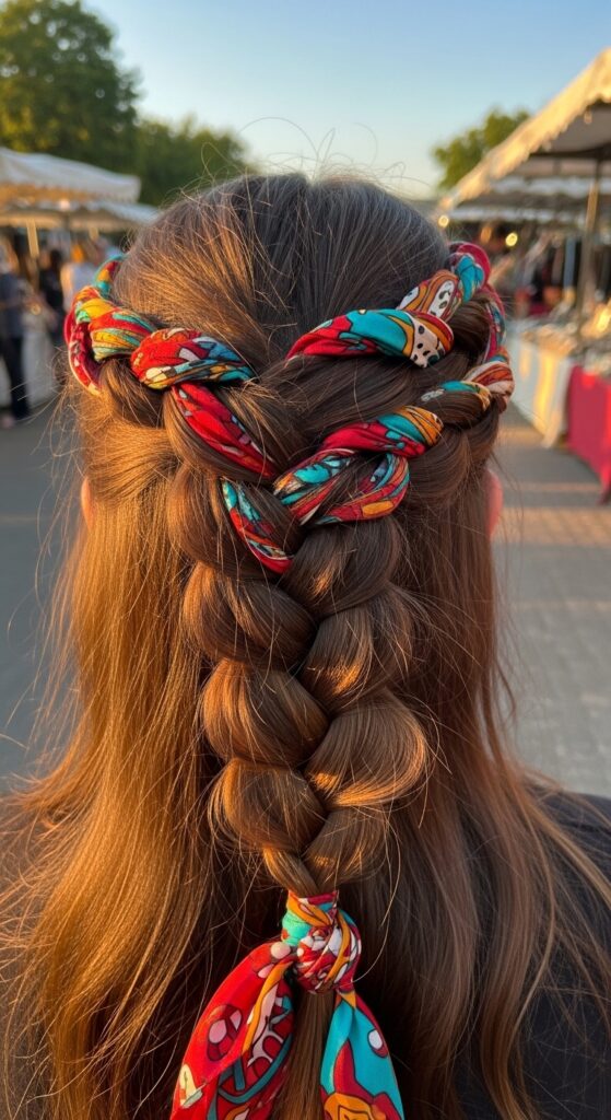 Fold a small scarf and treat it as an extra strand in your braid. It’s an instant mood booster and adds a pop of color without dyeing your hair.