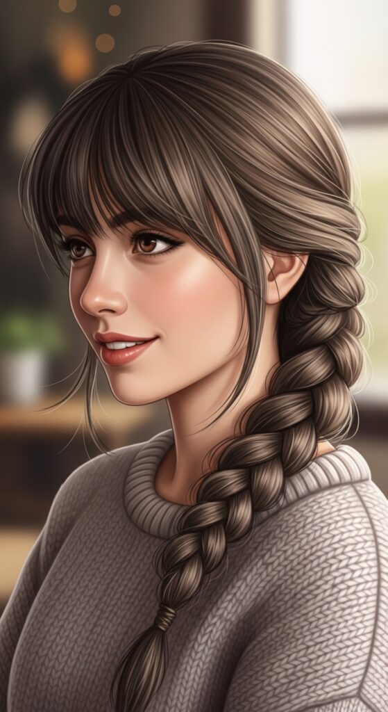 - Curtain bangs blend perfectly into the braid texture