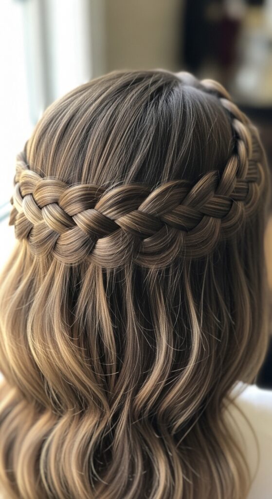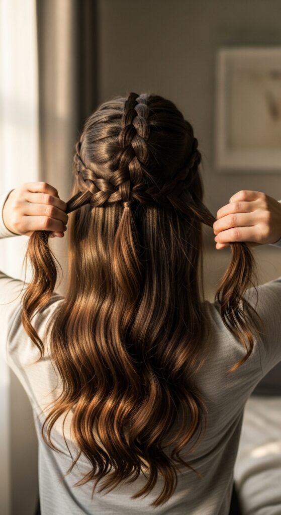 Braid only the top half of your hair from the crown, then let the rest hang loose. It’s the perfect middle ground between “I tried” and “I didn’t care.”