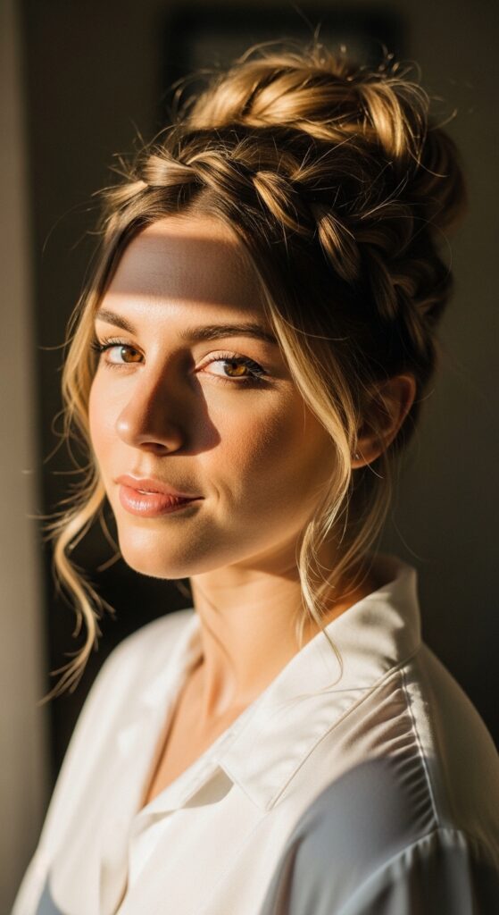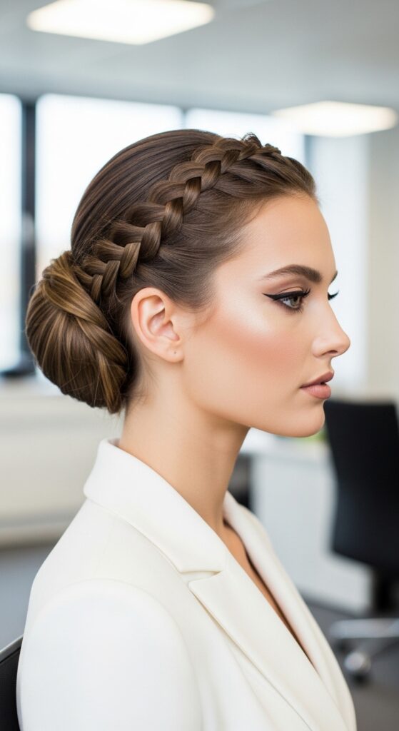 Braid your hair to the nape, then gather it into a low bun. It’s sleek enough for a job interview but still feels approachable. The braid adds texture that a regular bun lacks.