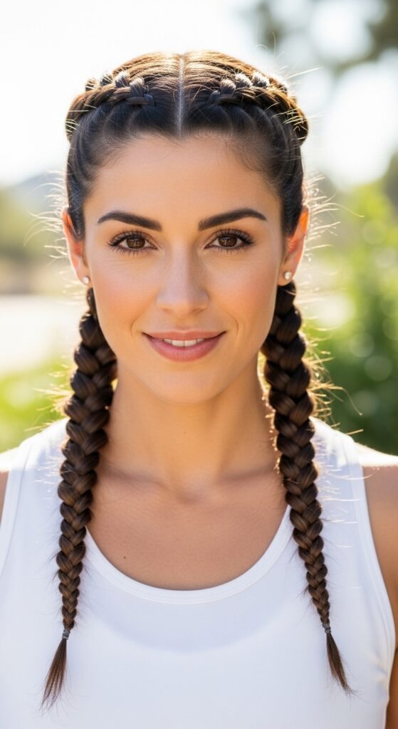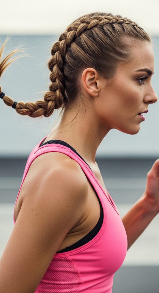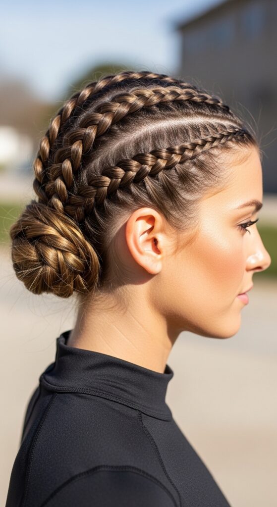 This is the sporty upgrade to a standard bun. Braid two Dutch braids from the front, then join them at the back and coil them into a low bun. It stays tight through any workout.