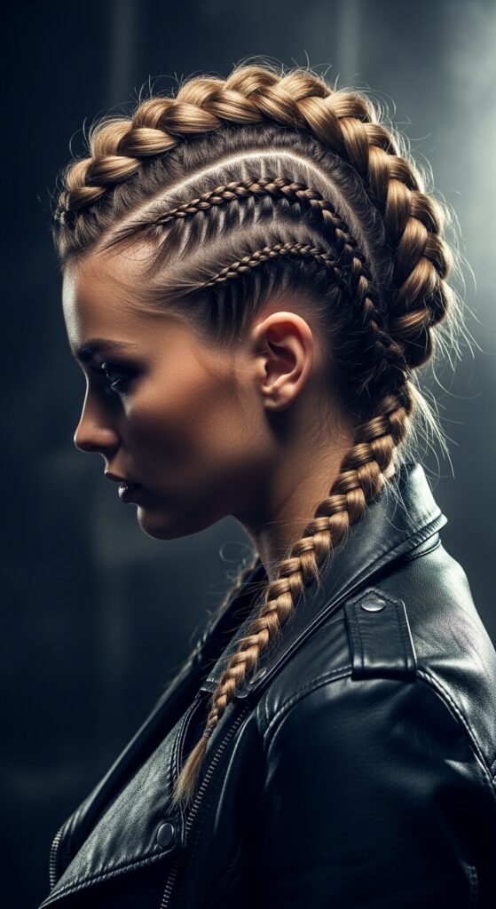 Start two Dutch braids at your temples, braid them backwards toward the crown, then join them or let them continue down. The raised center line gives a bold, punk-inspired look.