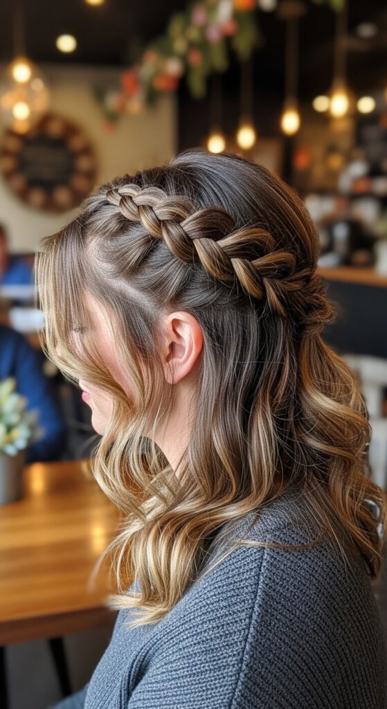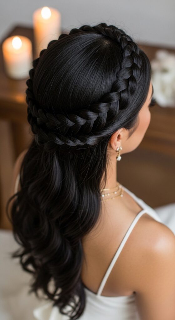 Take a front section from one side, near your part. Create a long rope braid, bring it across your forehead like a headband, and pin it behind your opposite ear. Tuck any ends under the rest of your hair.