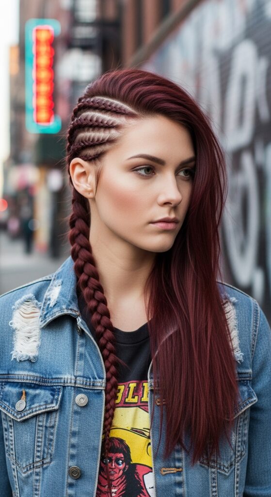 Channel those romantic goth hairstyles with a half-up style that’s both soft and dramatic. It’s ideal for a concert, a night out, or whenever you want to express a darker romantic aesthetic.