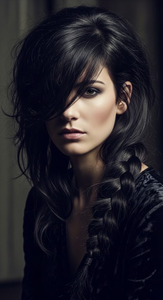 Use a deep side part. Take a section from the heavier side and create a loose, messy rope braid, letting it fall over your shoulder. Pair it with deep, lived-in color and tousled waves for that mysterious, romantic effect.