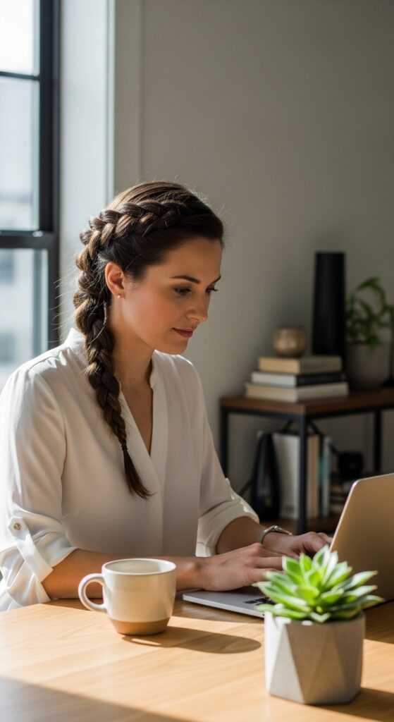 This is my weekday MVP. A rope braid is just two strands twisted around each other—it’s easier than a regular braid and looks so chic. It keeps hair out of your face for focus time but feels soft and pretty.