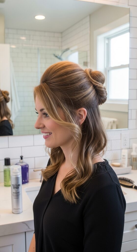 Tease the hair at your crown lightly. Gather a large top section, twist it once or twice, then wrap it into a loose knot and pin it. Don’t pull all the hair up—leave the back and sides down. Fluff the knot for maximum effect.