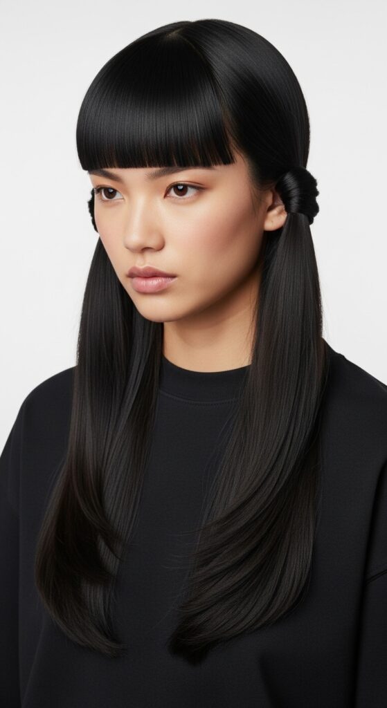 The hime cut—with its dramatic face-framing and blunt cuts—is a major trend. You can channel this look even without the cut by focusing on strong, blunt front sections.