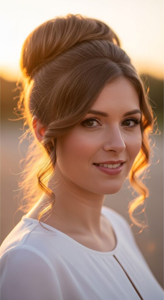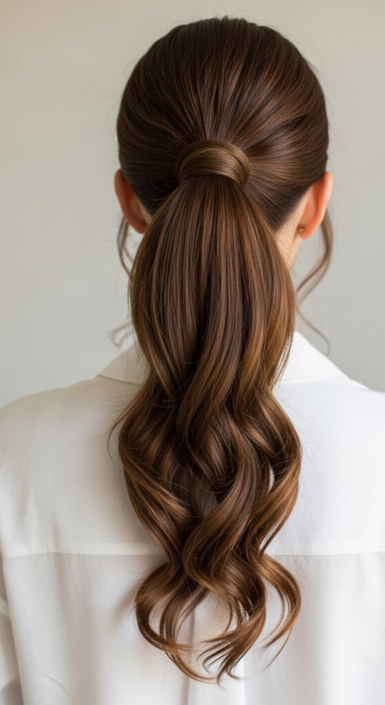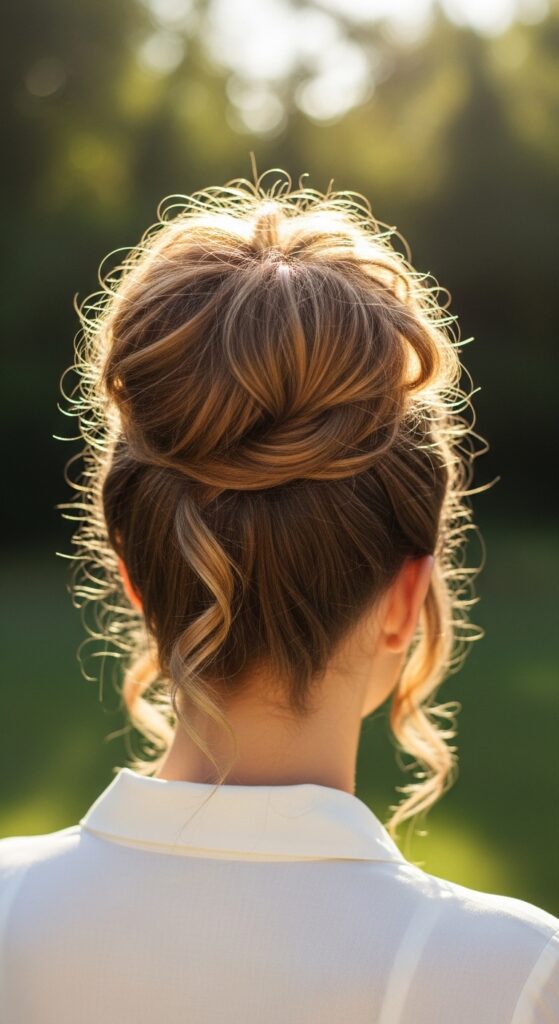 This style gives you the height and polish of a bun with the movement of a ponytail. It’s a great option if you find traditional buns too stiff or uncomfortable. The wrapped section adds a beautiful detail.