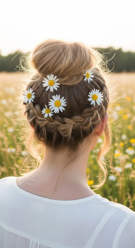For a festival or a summer day, this boho-inspired look is perfect. It combines loose, pretty braids with a carefree bun. It looks intricate but is built from simple elements. Add some fresh flowers for the ultimate touch.