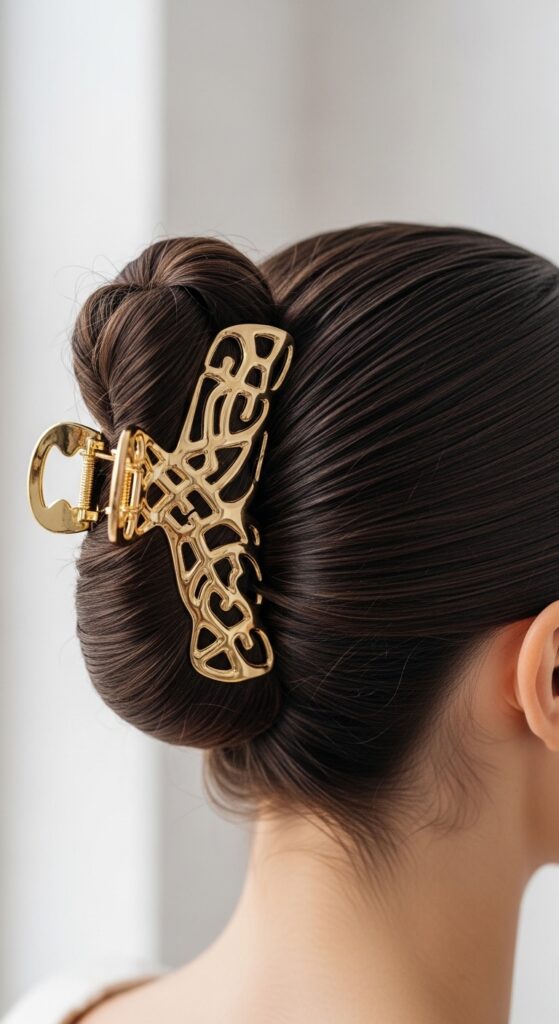 Choose a clip with interesting texture: a tortoiseshell claw, a simple gold bar, or a bejeweled piece. Slide it in horizontally right under the bun for a secure and stylish hold.