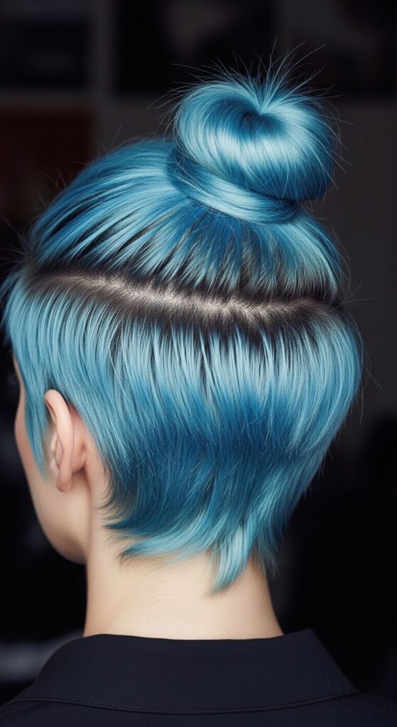 If you have a pixie, undercut, or just a lot of shorter layers, you can still participate! A mini bun on the very top of the crown is adorable and edgy. It’s a playful way to get your hair off your face.