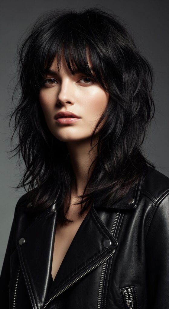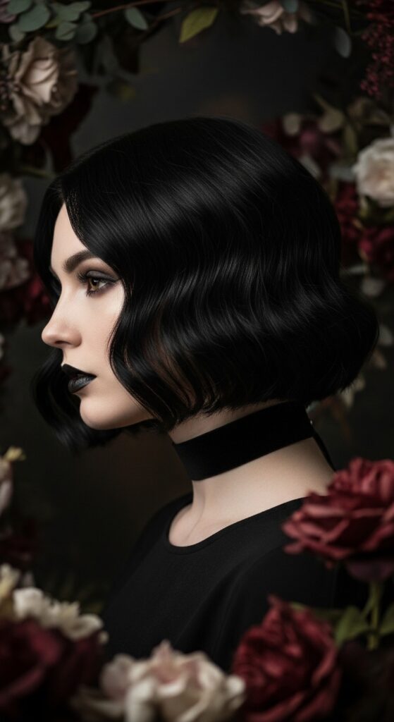 Merging softness with edge, this is a key look in romantic goth hairstyles. Imagine deep, dark hair (think espresso or black) with soft, face-framing layers and maybe a few hidden streaks of burgundy or shadow root.