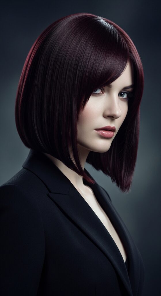 The rest of the hair is a blunt lob. It’s a geometric, striking look that draws attention to your eyes and cheekbones. It looks best sleek and straight, emphasizing the clean lines.