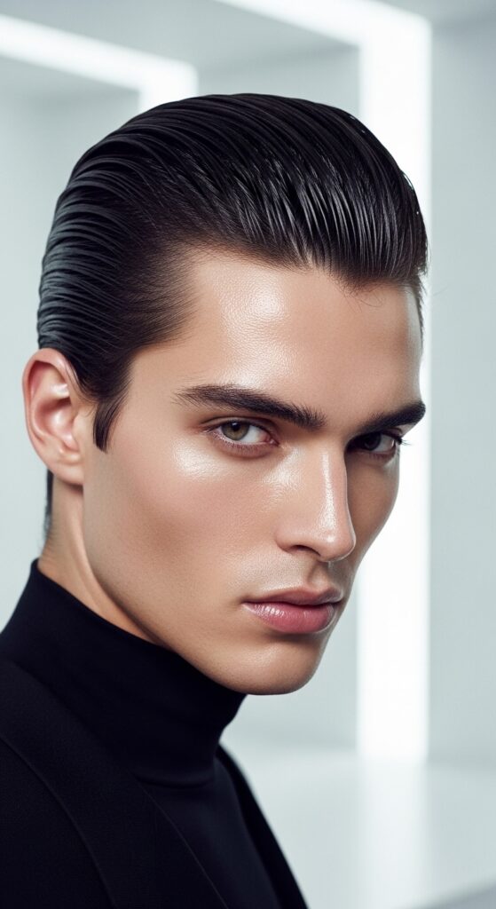 The key is a seamless transition from the slicked front to the tight bun at the back. Use a fine-tooth comb for precision.