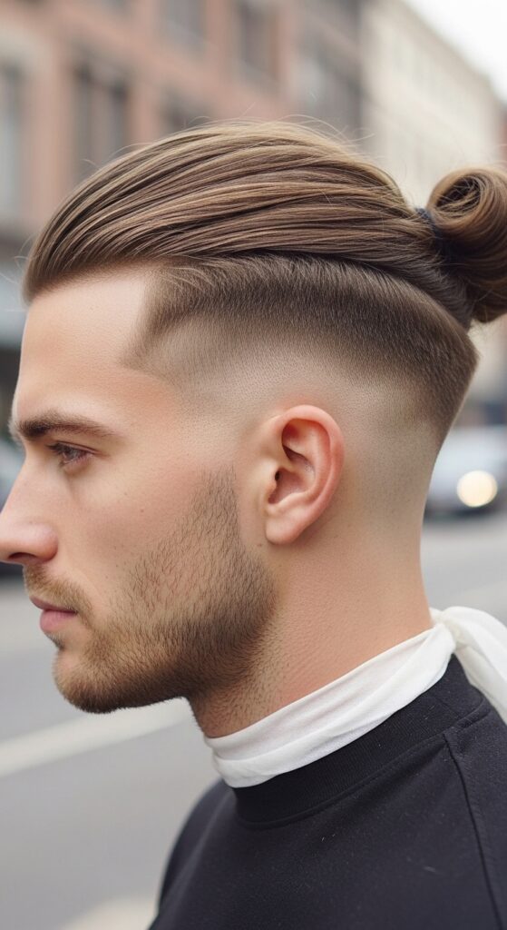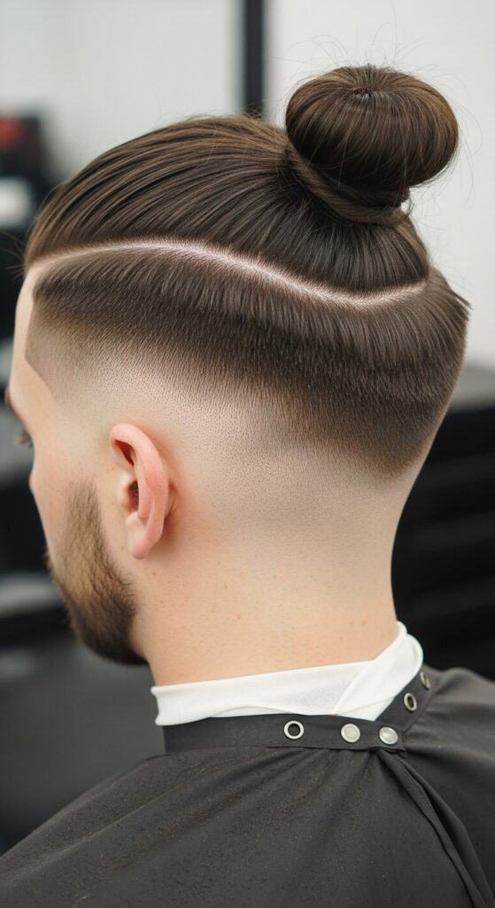 Maintain your taper with regular barber visits. The bun is the showcase, but the cut does half the work.