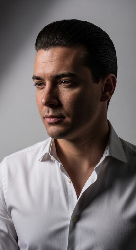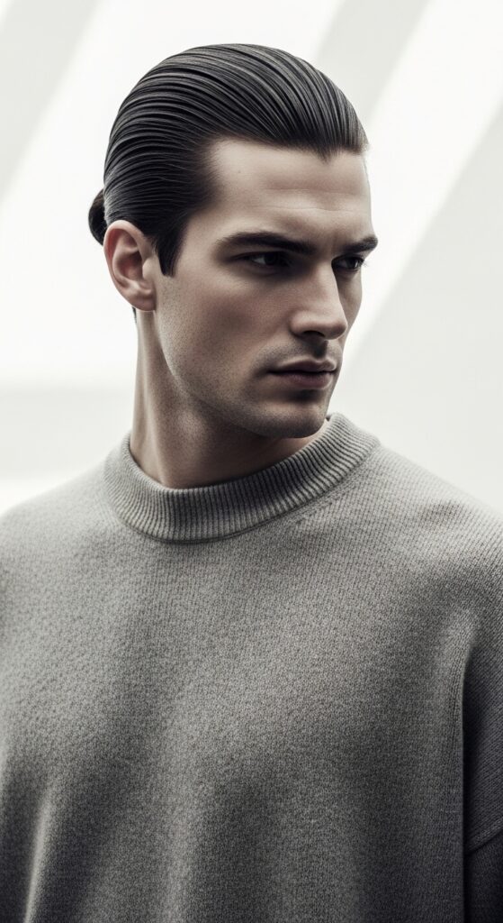Start with brushed hair. A light-hold pomade or cream can help tame any wisps. The goal is smooth, not slick.
