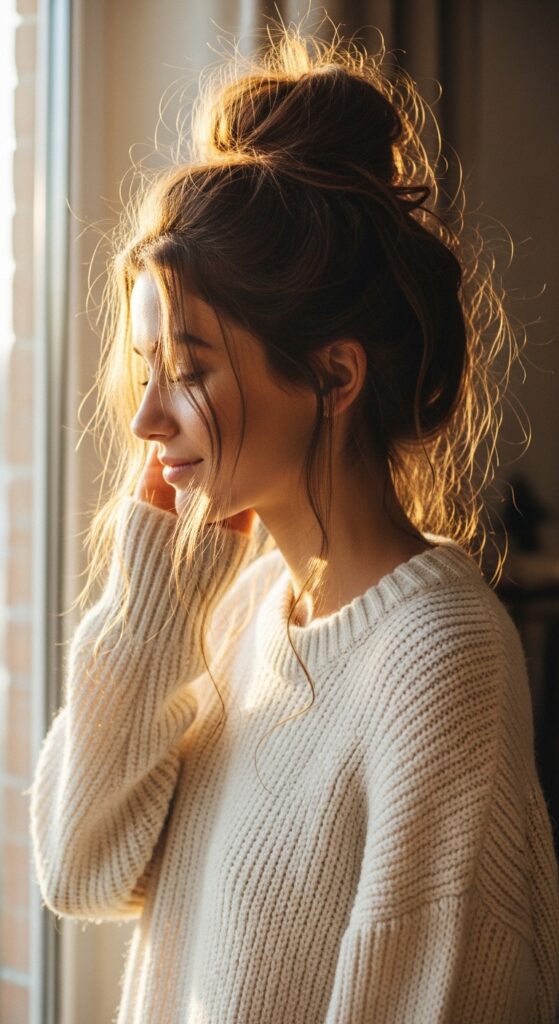 Sometimes, you just need your hair up and out of the way. This is that bun. It’s quick, it’s lazy, and it’s honestly a vibe for lazy Sundays or working from home.