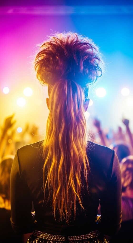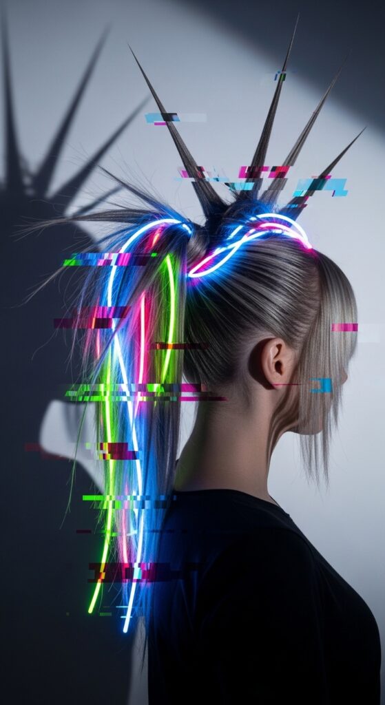 Glitchy glam hair is about intentional imperfection and digital-age texture. Think pieces sticking out at odd, artistic angles. Create a high pony, but instead of smoothing it, purposefully pull out chunks and spikes.