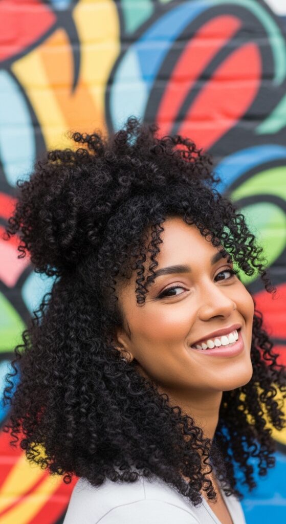 Secure with a coiled hair tie (it’s gentler). After tying, gently pull apart a few curls around your face and crown for more volume. Let your natural texture be the star—it’s effortlessly gorgeous.