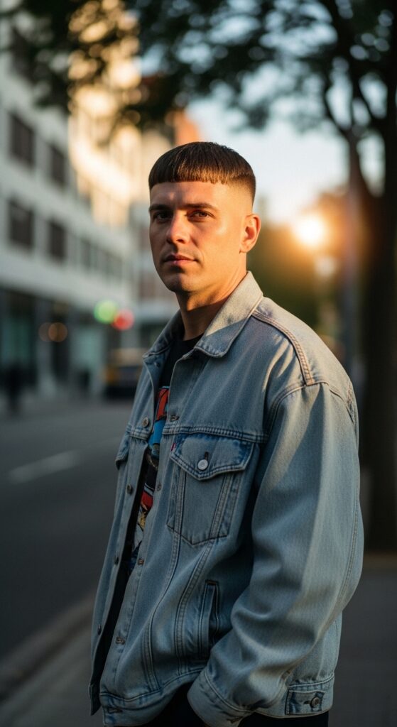 Bald isn’t boring when the line-up is razor sharp. A short buzz (number 2 or 3 guard) with a crisp edge along your forehead and temples is modern and clean. It’s the ultimate quiet luxury option for guys who don’t want to think about their hair. Just a quick edge-up every week and you’re golden. Bonus: it makes you look more awake.
