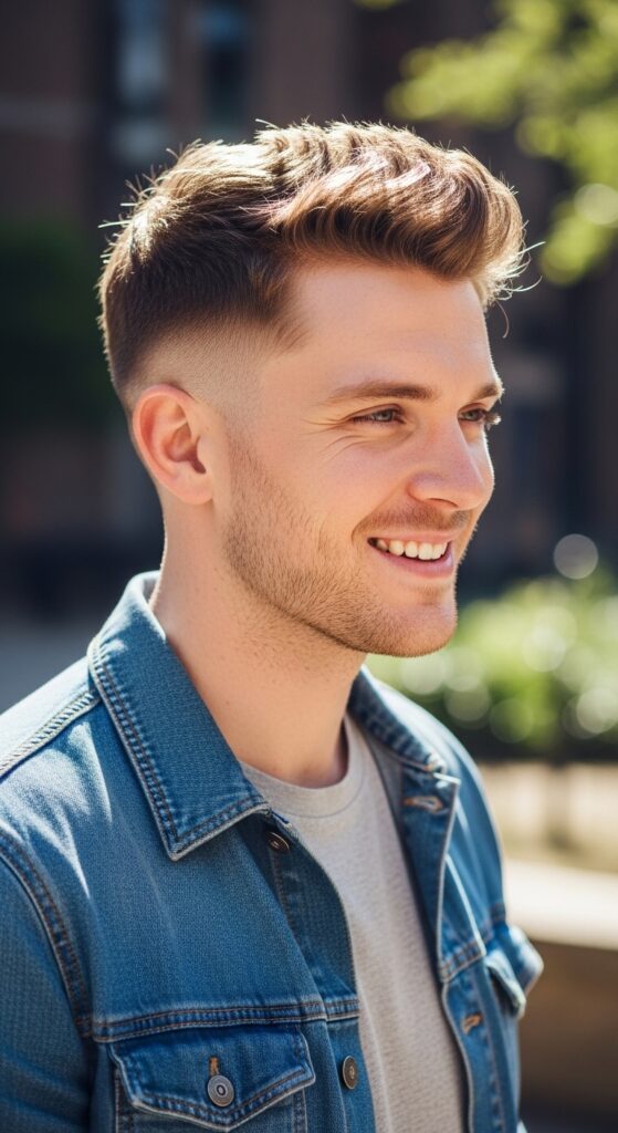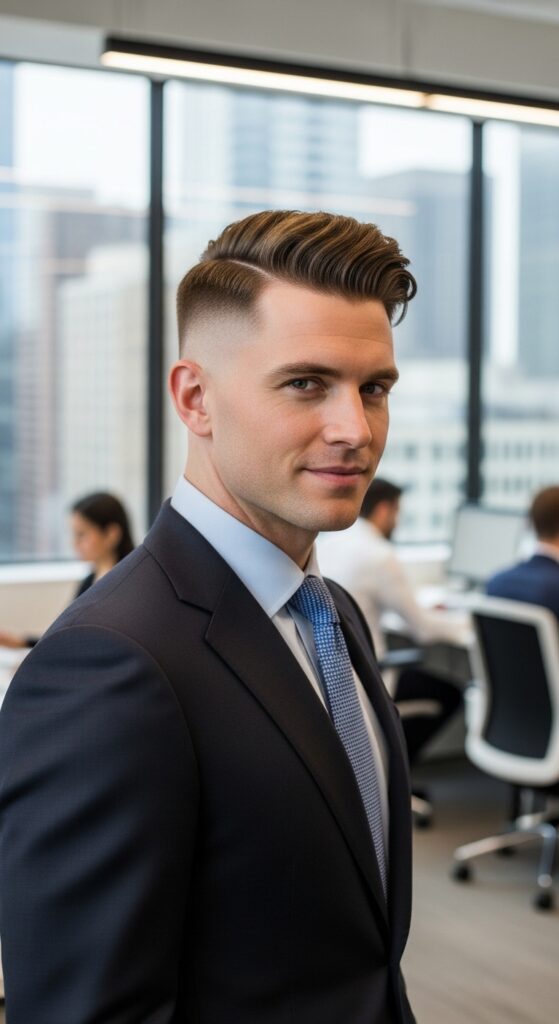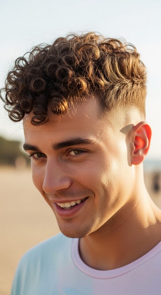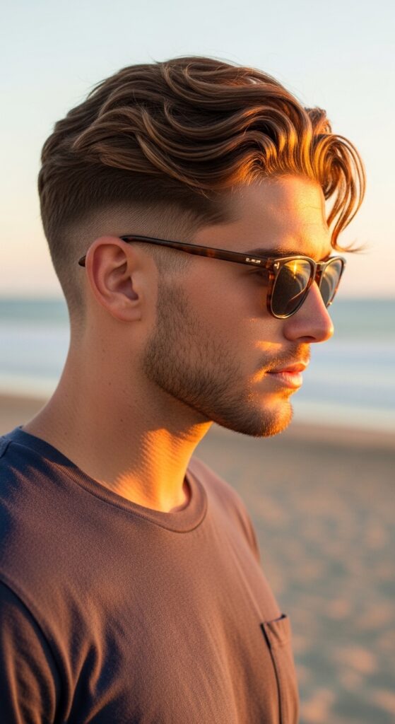 If you’ve got natural waves, let them shine. This cut keeps the sides faded low while leaving enough length on top for your waves to do their thing. Use a leave-in conditioner and scrunch when wet. No brushing—just let them dry naturally. It’s effortless, beachy, and still looks professional when you tuck the sides down.