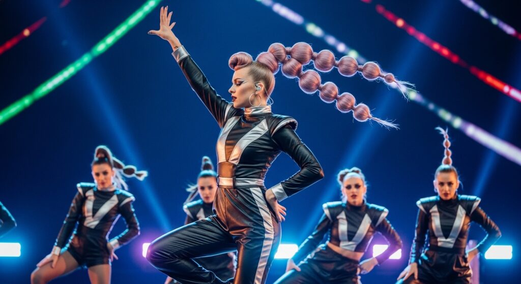 Futuristic and fun. This playful style involves tying elastics down the length of a ponytail and puffing out the sections between them to create “bubbles.” It’s a great look for pop, K-pop, or any high-energy, playful performance.