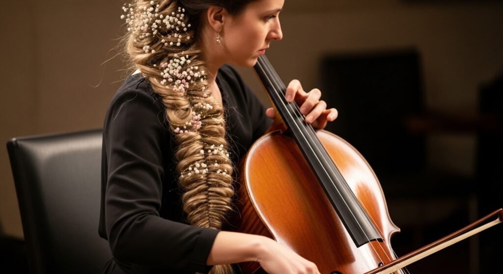 Bohemian and intricate. A fishtail braid, whether side-swept or down the back, adds beautiful texture and keeps hair securely contained. It’s more detailed than a standard braid, perfect for singers-songwriters or indie artists.