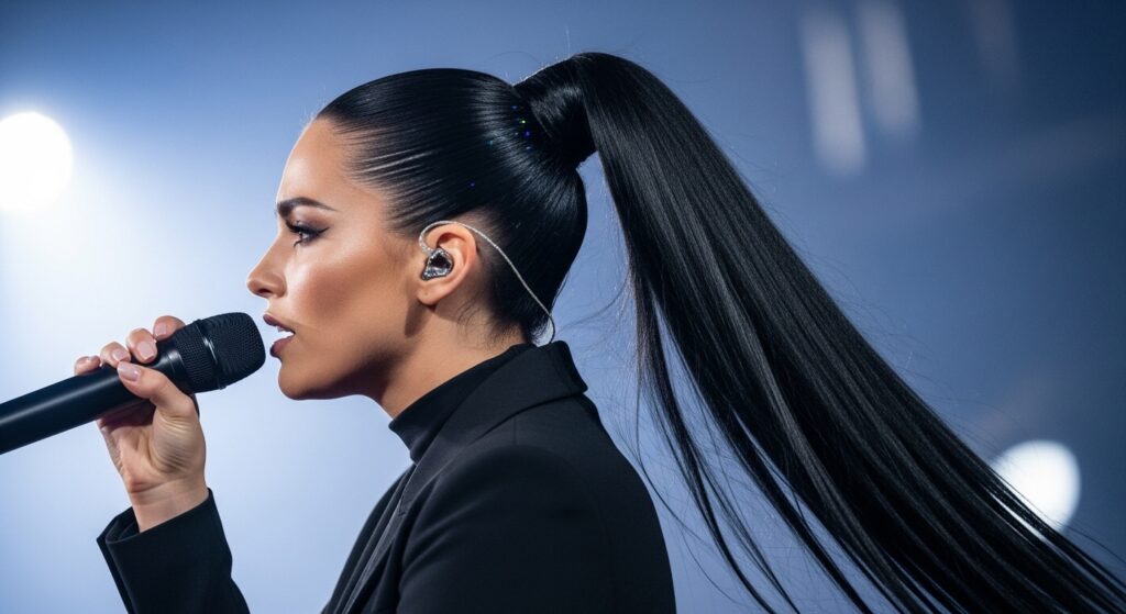 A powerful and polished look that keeps hair securely off the face. It says confidence and command. For extra stage impact, wrap a small section of hair around the elastic to conceal it, or add a bold hair cuff. This style is perfect for high-energy performers who need zero distractions.