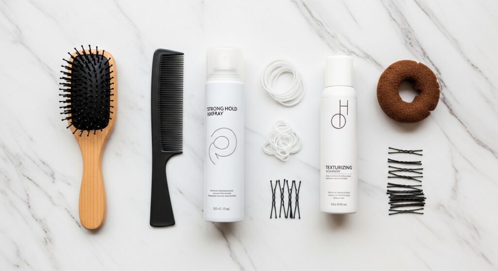 Success starts with preparation. For the sleekest looks, you’ll need a good grip and smooth texture. Invest in a strong-hold hairspray, a fine-tooth comb (or a bristle brush for smoothing), and plenty of clear elastics that blend in. For textured styles, dry shampoo and texturizing spray are your best friends.