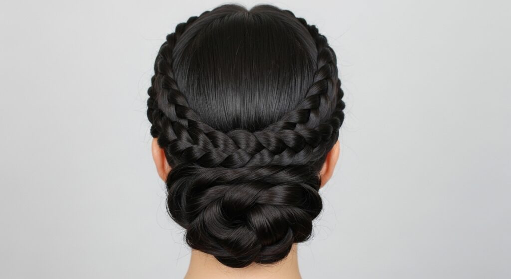 10. Four-Strand Braid Bun: A stunning upgrade. Make a low ponytail, divide into four sections, and create a four-strand flat braid. Coil into a bun.