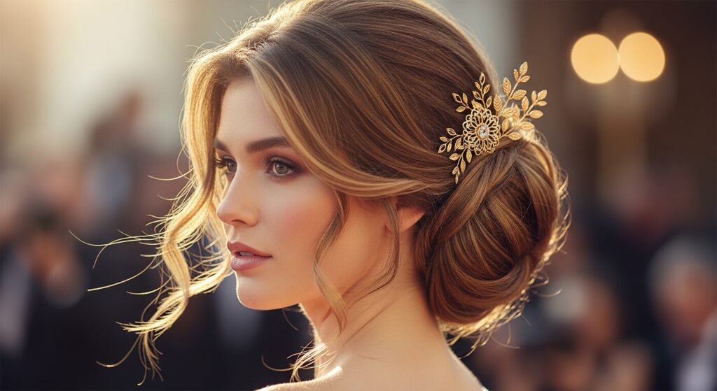 14. Tousled Updo with Face-Framing Pieces: Pull hair back loosely, allowing small pieces to escape at the front and sides. Twist and pin at the back for a soft, romantic look.